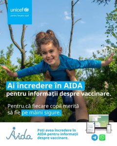 AIDA este un asistent pentru imunizare, creat de #UNICEF ca să-ți ofere răspunsuri sigure și de încredere despre vaccinarea copilului tău. 💬